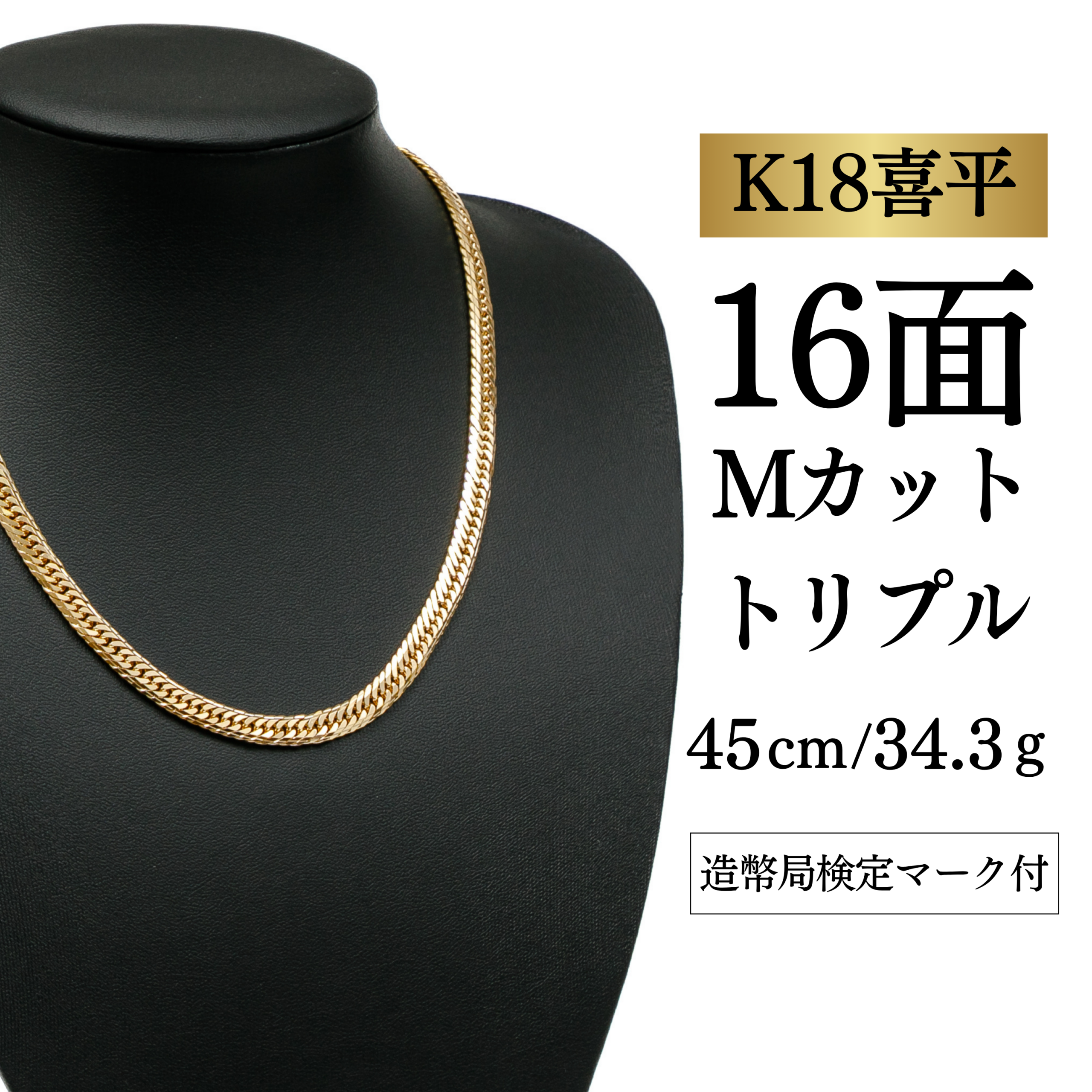 【K18YG/18金】イエローゴールド 喜平ネックレス 16面カット トリプル【34.3g / 45cm】