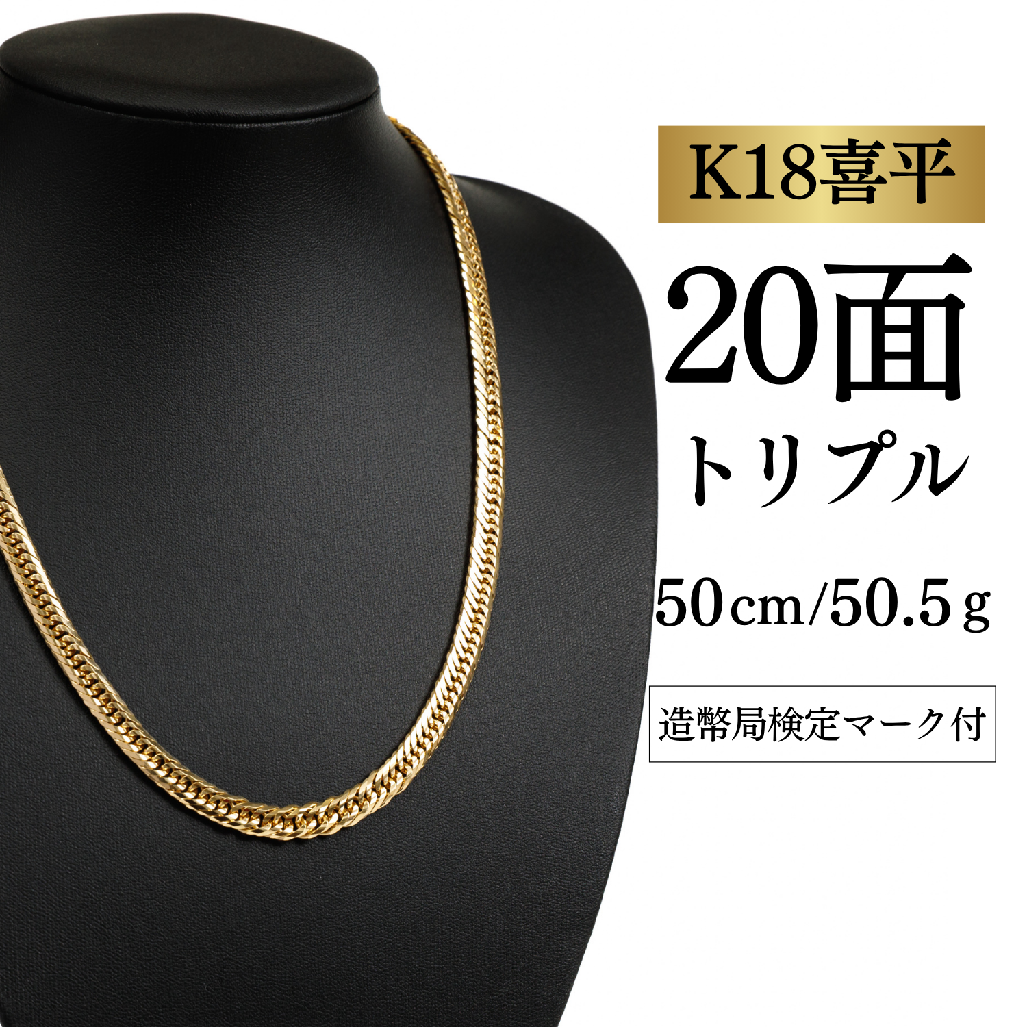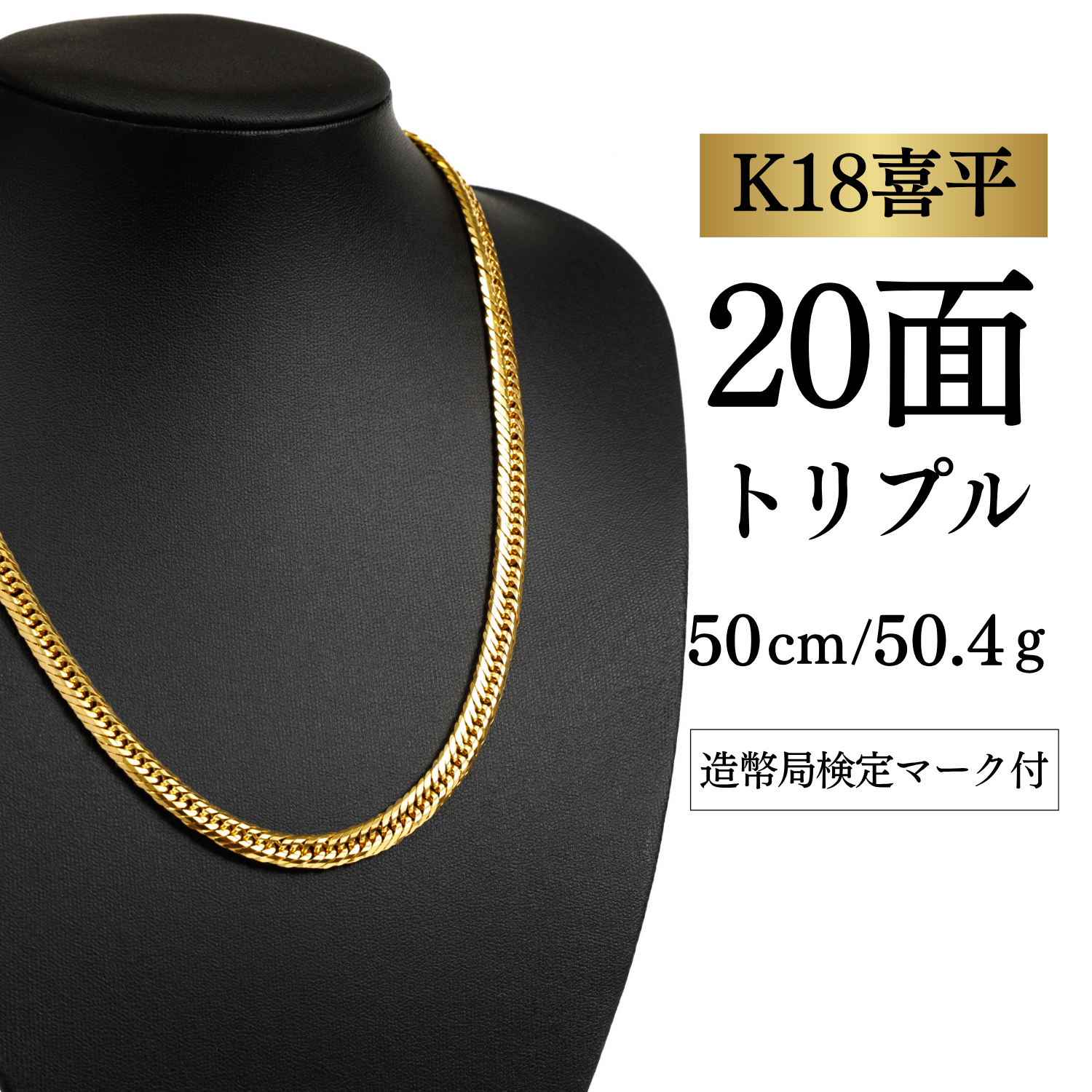 【K18YG/18金】イエローゴールド 喜平ネックレス 20面カット トリプル【50.5g / 50cm】